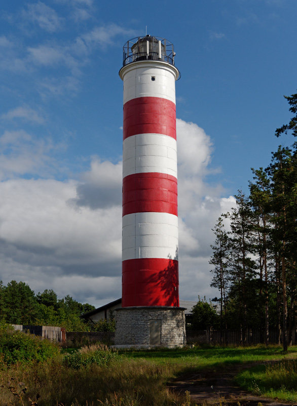 Laternaruumi ja musta rõduga valge-punasetriibuline betoontorn