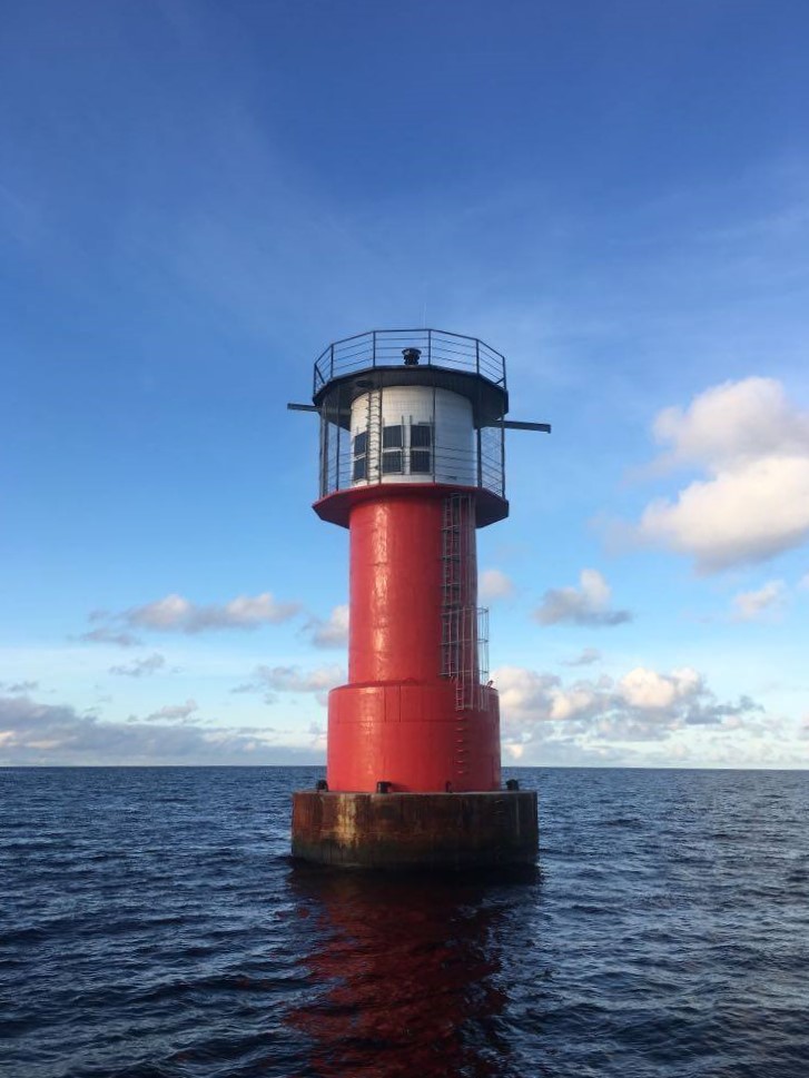 Ülalt valge, alt punane metalltorn.Kaks punast rõdu