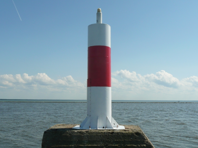 Punase rõhttriibuga valge metallsammas betoonalusel