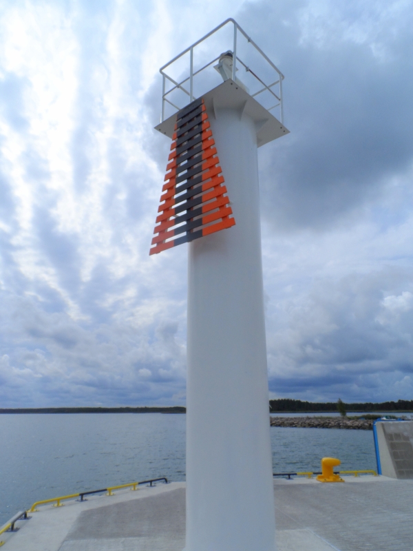 Musta püsttriibuga oranz trapetsikujuline tahvel, lühem külg ülal, valgel metallpostil