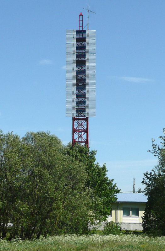 Musta püsttriibuga valge täisnurkne tahvel metallsõrestiktornil
