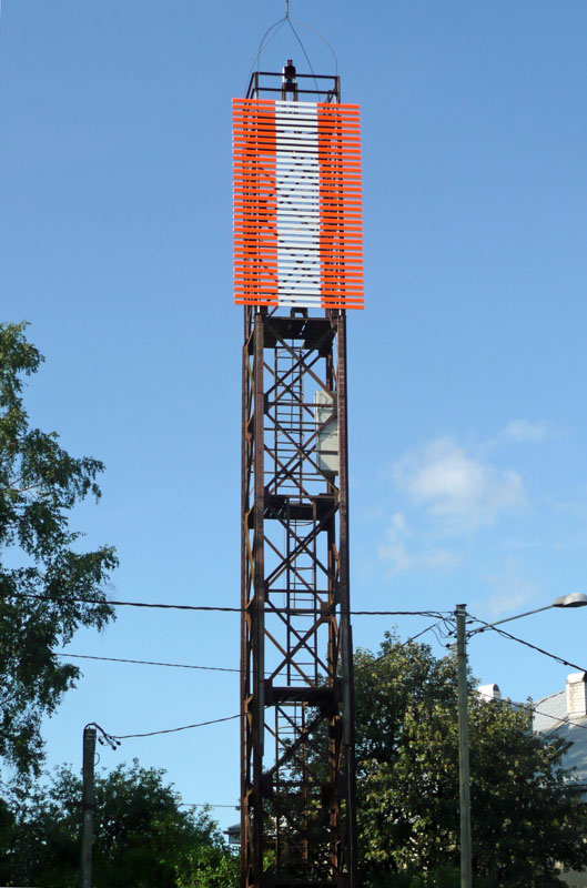 Valge püsttriibuga oranz täisnurkne tahvel metallsõrestiktornil