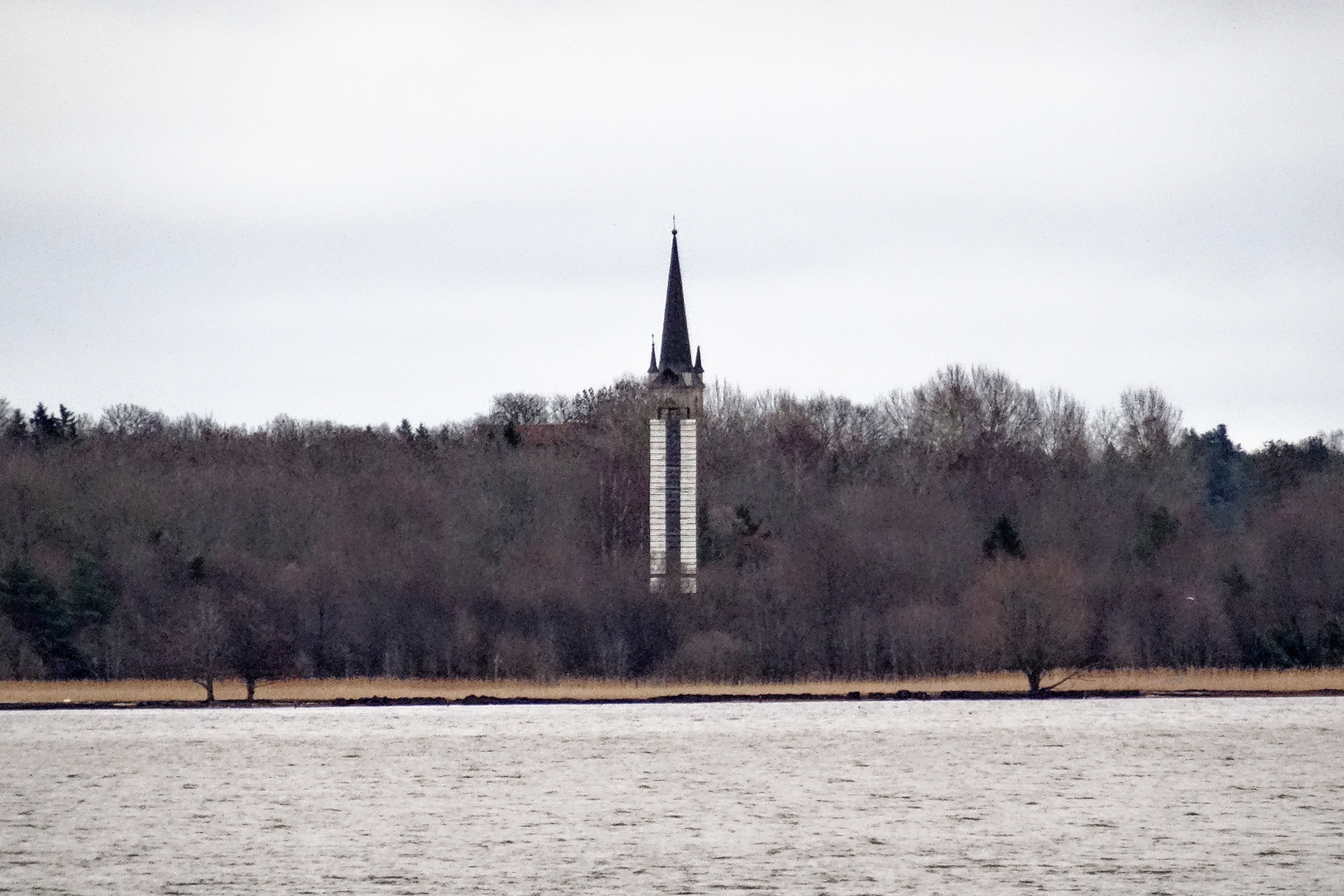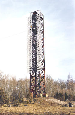 Musta püsttriibuga valge täisnurkne tahvel metallsõrestiktornil