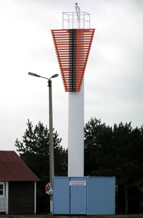 Musta püsttriibuga oranz trapetsikujuline tahvel, lühem külg all, valgel metallpostil