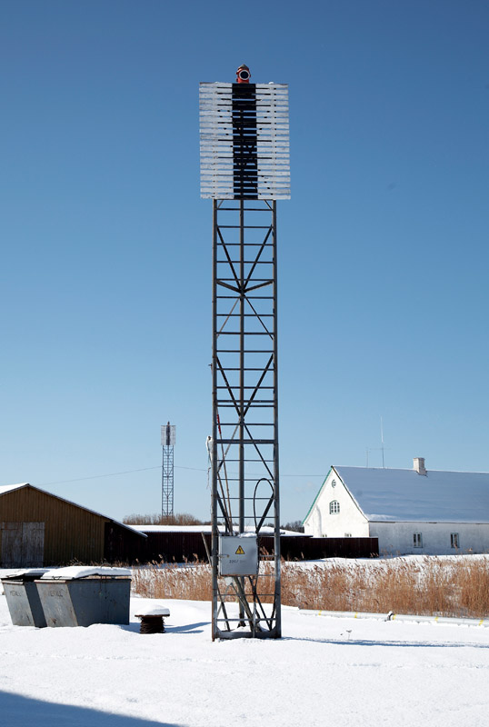Musta püsttriibuga valge täisnurkne tahvel metallsõrestiku tipus