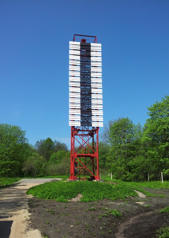 Musta püsttriibuga valge täisnurkne tahvel metallsõrestiktornil