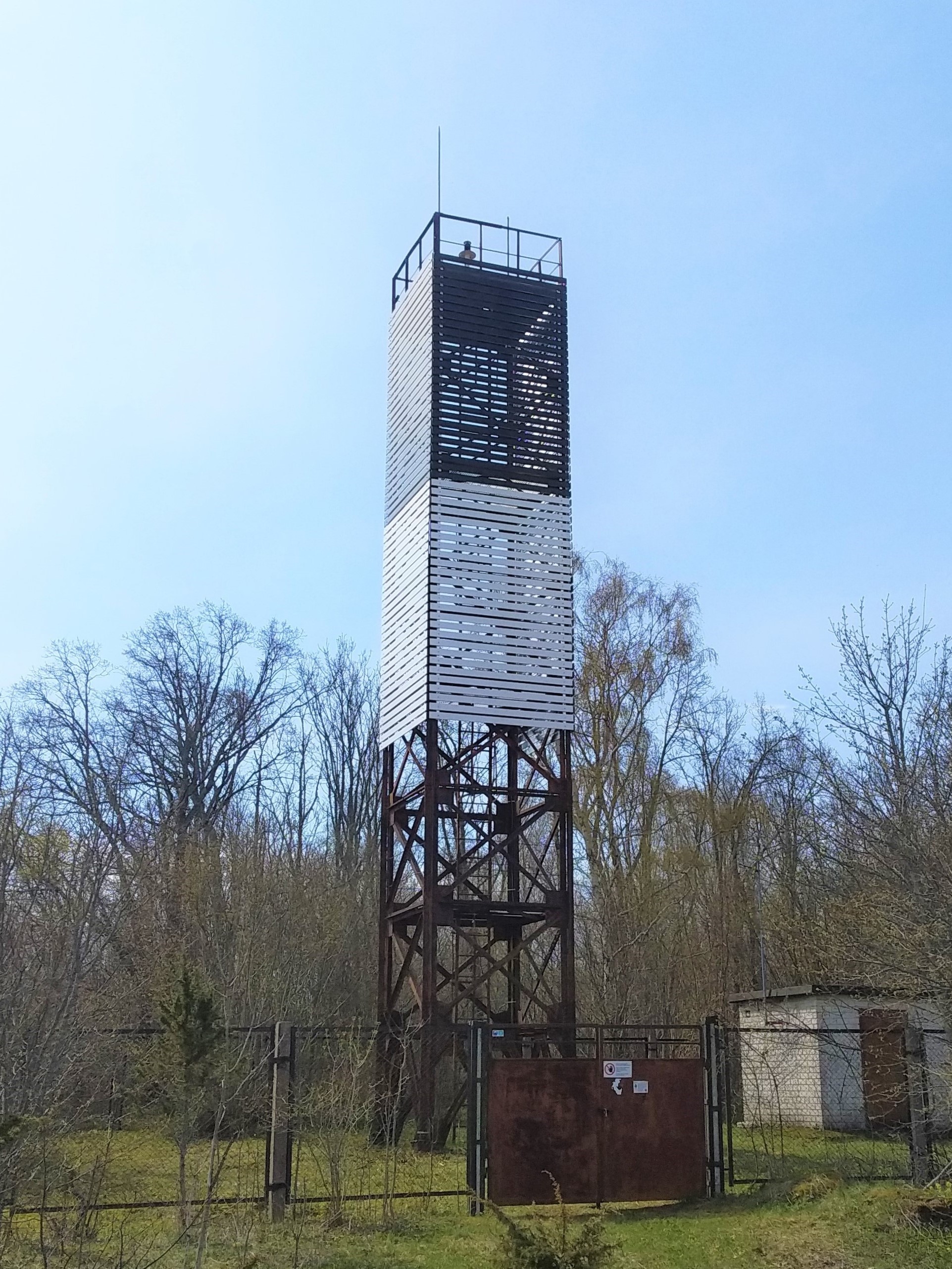 Ülalt must, alt valge laudis metallsõrestiktorni kolmel küljel