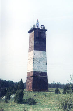 Punane neljatahuline betoontorn. Keskel lai valge rõhttriip
