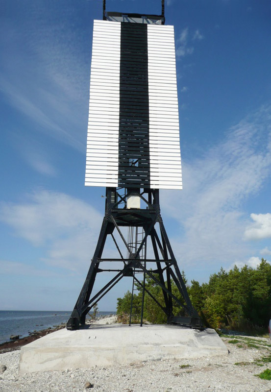 Musta püsttriibuga valge täisnurkne tahvel metallsõrestiktornil