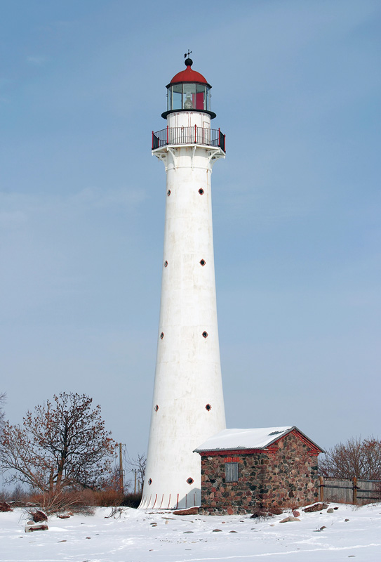 Laternaruumi ja rõduga valge kooniline metalltorn