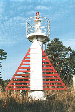 Valge püsttriibuga punane kolmnurk valgel, rõduga metallsambal