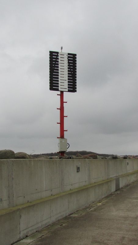 Valge püsttriibuga must täisnurkne tahvel punasel metallpostil