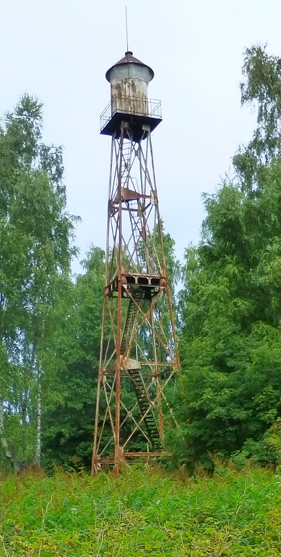 Punase koonilise katusega valge silinder metallsõrestiktornil
