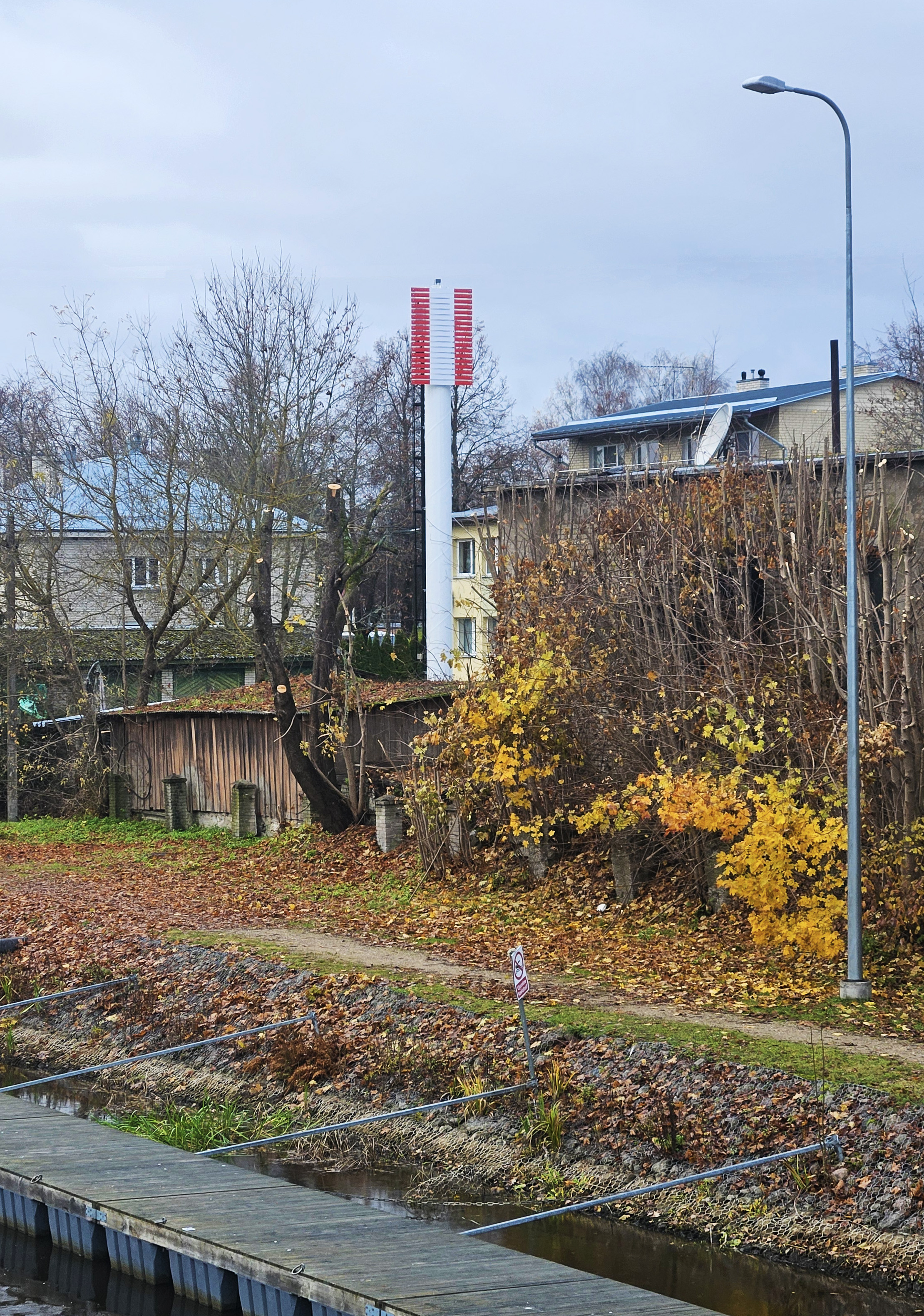 Valge püsttriibuga punane täisnurkne tahvel metalltorul