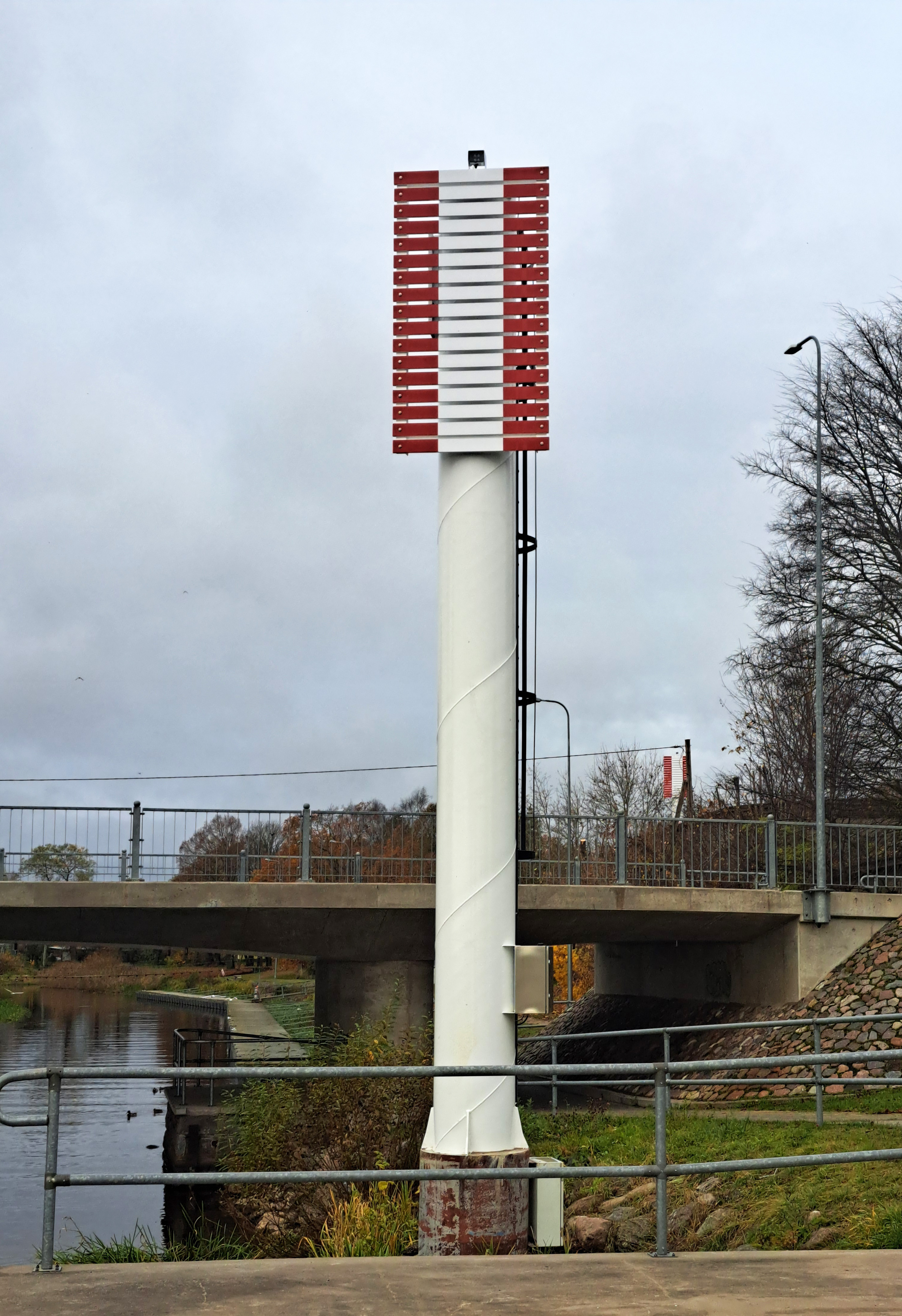 Valge püsttriibuga punane täisnurkne tahvel metalltorul