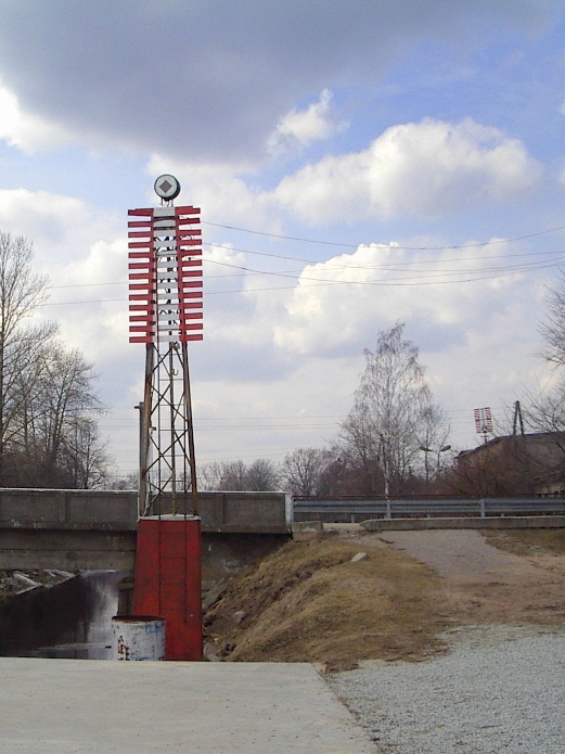 Valge püsttriibuga punane täisnurkne tahvel metallsõrestikmastil